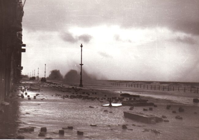 Het strand voor het Thermae Hotel bij extreem hoog tij (springtij ?) en stormachtig weer.