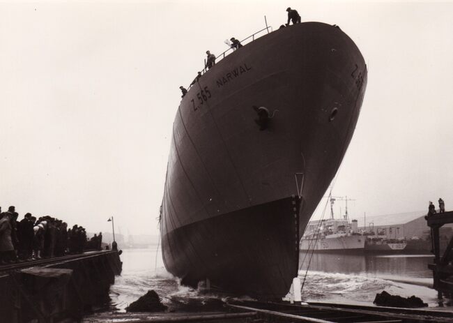 De Z.565 "Narwal" gaat het Zwaaidok in aan de scheepswerf Beliard-Murdoch. Rechts op de achtergrond enkele marineschepen. De stalen hektreiler was ook een fabriekschip en vriestreiler en werd gebouwd voor de…