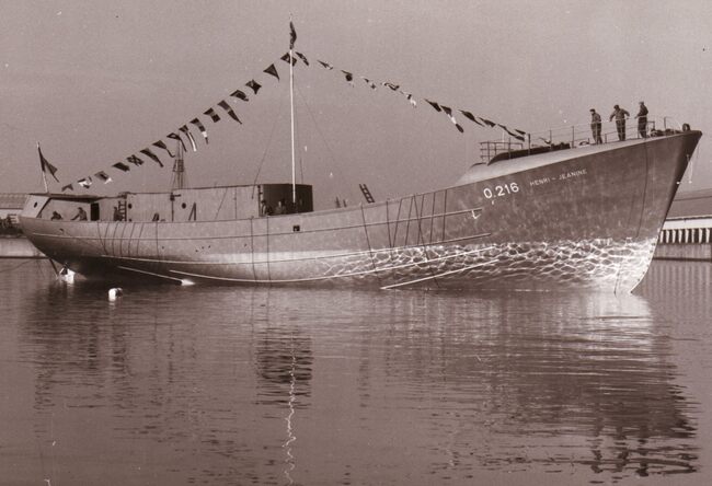 Het Zwaaidok. De O. 216 "Henri Jeanine" is zopas te water gelaten van op de scheepswerf Beliard-Crighton & C°. De stalen diepzeetreiler werd gebouwd voor de reders Henri Cornelis Lambregt en Henri Charles…
