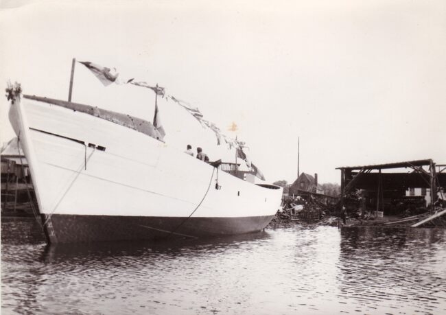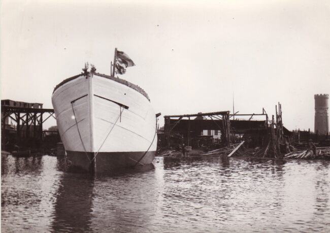 De O.315 "Beatrix Fernande" kort na zijn van stapelloop in het thans verdwenen 3e handelsdok. Op de achtergrond de verschillende scheepswerven en rechts de oude watertoren. Houten diepzeetreiler in 1947 gebouwd…
