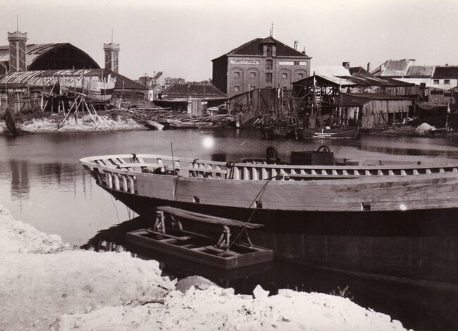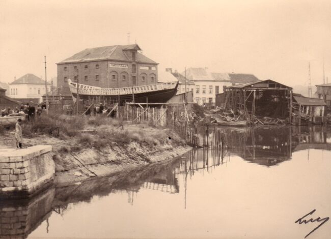 De scheepswerf Hillebrant A. en Zonen gelegen aan de Werfkaai tussen de scheepswerven van August Loy en Jules Denye. Een houten vissersvaartuig staat op stapel.