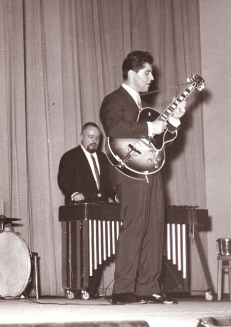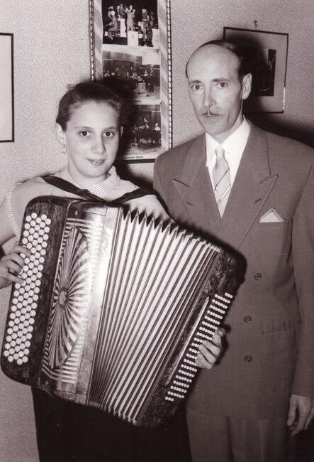 De accordeonvirtuose Astrid DE LAENDER,° Oostende 03-08-1938, met haar lereaar (of vader ?).