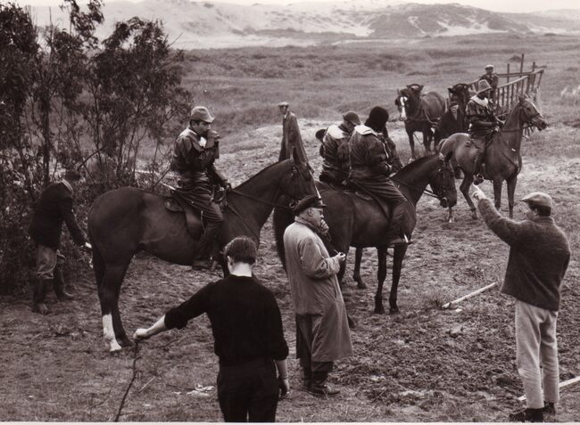 Filmopnamen in de duinen voor een film met o.a. de Franse acteur Gerard PHILIPE, enkele figuranten uit die film.