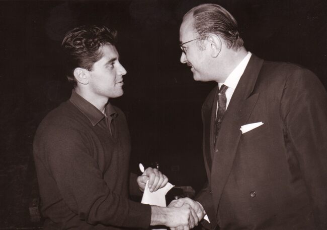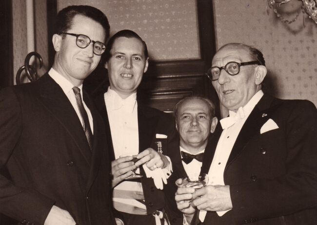 De Franse zanger Sacha DISTEL (° Parijs 29-01-1933 als Sacha Alexandre DISTEL + Rayol-Canadel-sur-Mer 22-07-2004) na een optreden in het kursaal gefeliciteerd door Roger DE RAMEE concessionnaris van het kursaal.