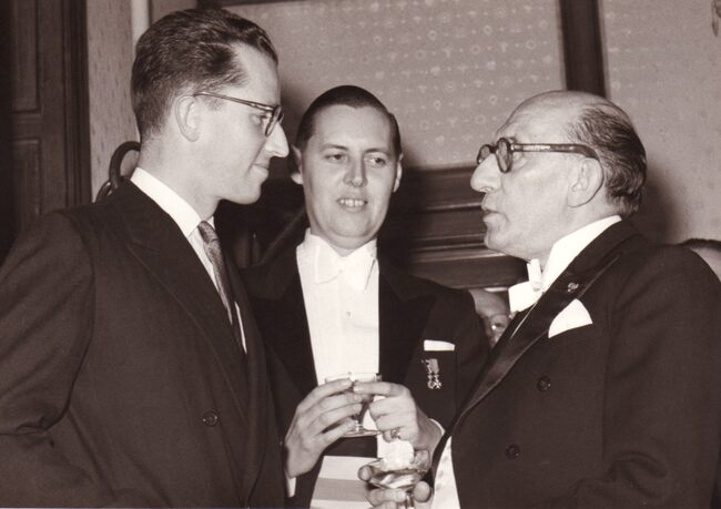 Formaat : 13 x 18 cm. - Koning Boudewijn in gesprek met de voorzitter van het Koninklijk Landjuweel Paul Van Aerden.Tussen hen, burgemeester Jan Piers. De voorstellingen gingen door in de Koninklijke Schouwburg (Van…