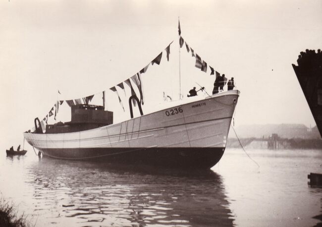 Het Zwaaidok. De O. 236 "Henriette" is zopas te water gelaten van op de werf Beliard-Crighton & C°. Stalen motortreiler gebouwd voor reder Henri Laplasse.