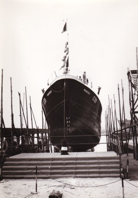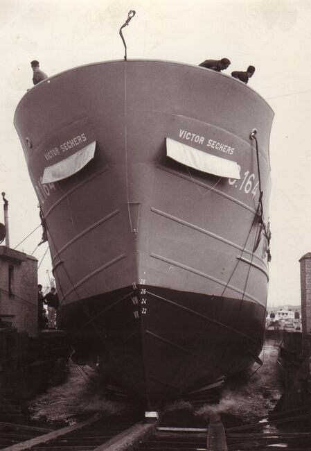 De O.164 "Victor Seghers" glijdt de helling af in het Visserijdok. Stalen hektreiler gebouwd op de scheepswerf Seghers voor de NV Polaris.