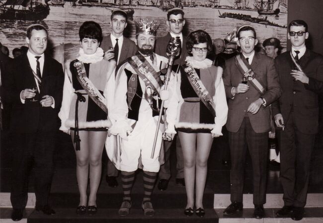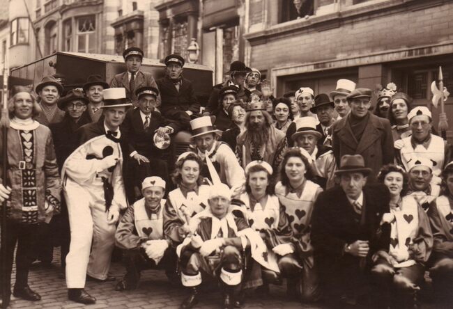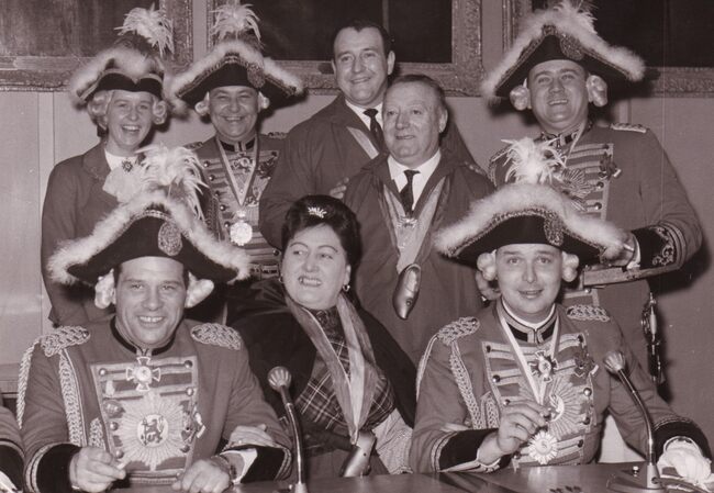 In het midden Blanche of Meetje van de koaje alias Blanche Belpaeme tussen het gevolg van de Prins Carnaval van Dusseldorf. Achter haar staat Fernand Monteny of de" witten van de koaje", allen lid van de "…