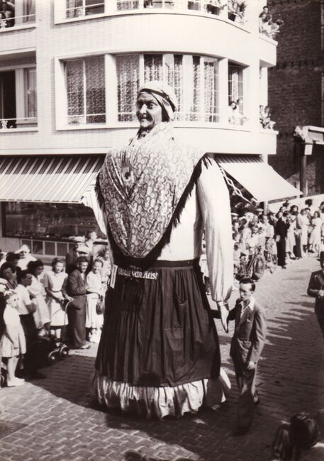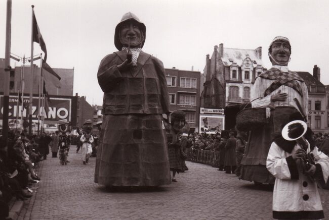 De Oostendse reuzen Tone en Wanne op het Wapenplein. Foto richting Breidelstraat. Rechts de Kerkstraat. Het Feest- en Cultuurpaleis is nog niet gebouwd.