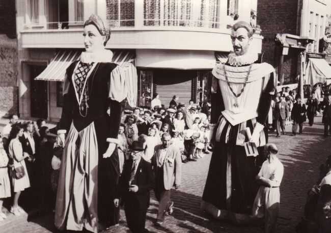 De reuzen Albrecht en Isabella uit Gent in de Kapellestraat, hoek Ooststraat.