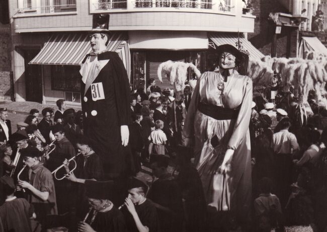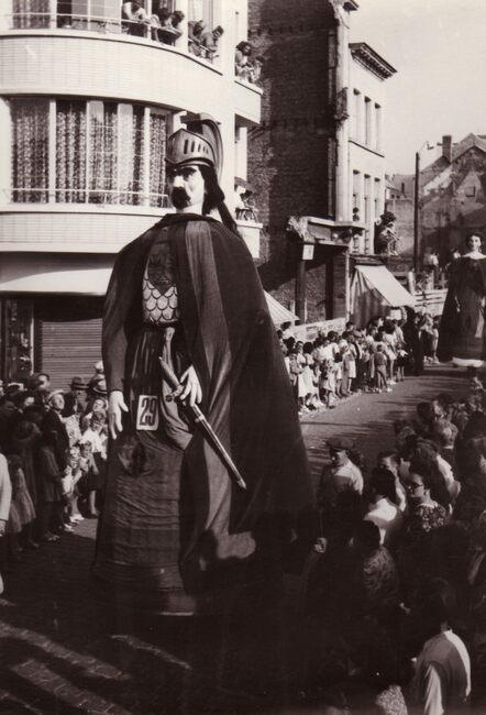 Waarschijnlijk de reuzen Pier en Wanne uit Knokke-Heist in de Kapellestraat, hoek Ooststraat