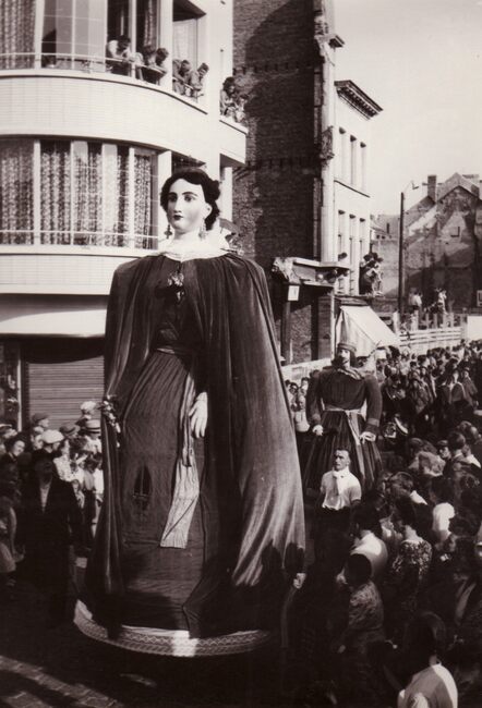 Een reus en reuzin in de Kapellestraat, hoek Ooststraat. Zij worden gevolgd door "Les Gilles du Pays Noir" (Charleroi)