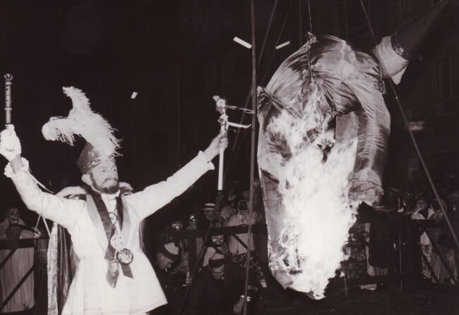 Na afloop van de cimanteirenstoet wordt "Tjannie Carbong" verbrand.Prins Carnaval juicht !