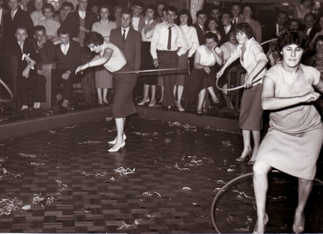 Enkele jonge dames wagen zich aan een wedstrijdje hoela-hoep (in het Wit Paard ?).