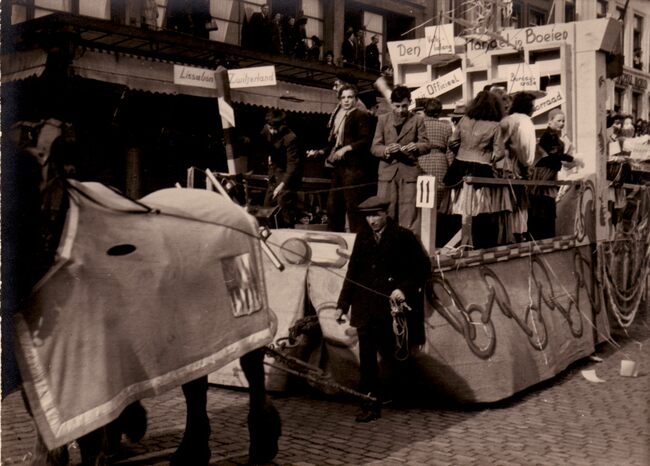 Een praalwagen getrokken door paard uit de carnavalstoet op het Wapenplein.