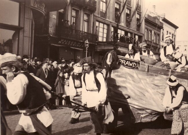 Groep nr.33 "De boottrekkers van de Volga" op het Wapenplein tijdens de carnavalstoet. De naam van de boot is Prawda (=waarheid) zoals de Sovjet partijkrant.