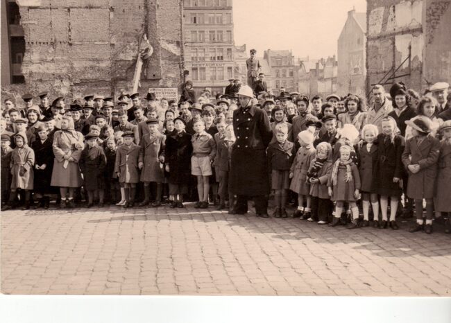 Oostendse kinderen wachten met hun ouders en onder de hoede van een witgehelmde politieagent op de doortocht van de carnavalstoet op het Wapenplein. Achter hen de Breidelstraat. Er is nog veel puin uit de Tweede…