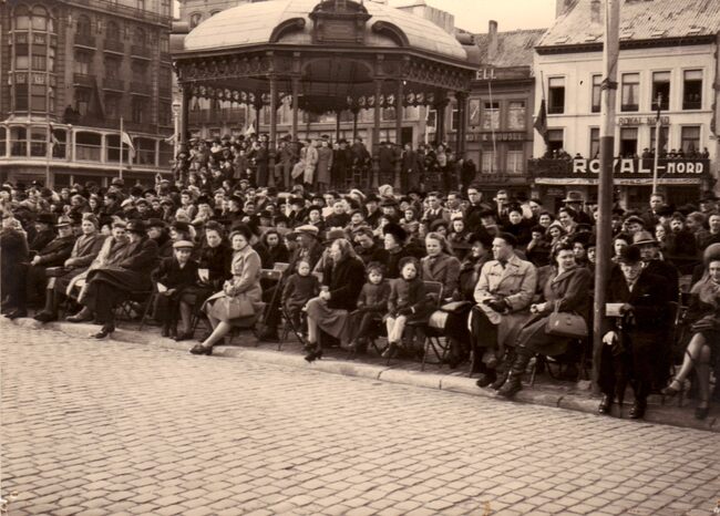 Het publiek op het Wapenplein tijdens de Carnavalstoet. De kiosk en op de achtergrond de Royal Nord.