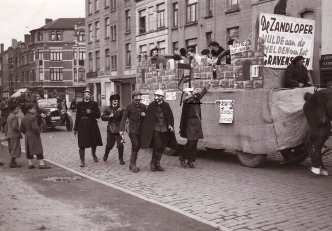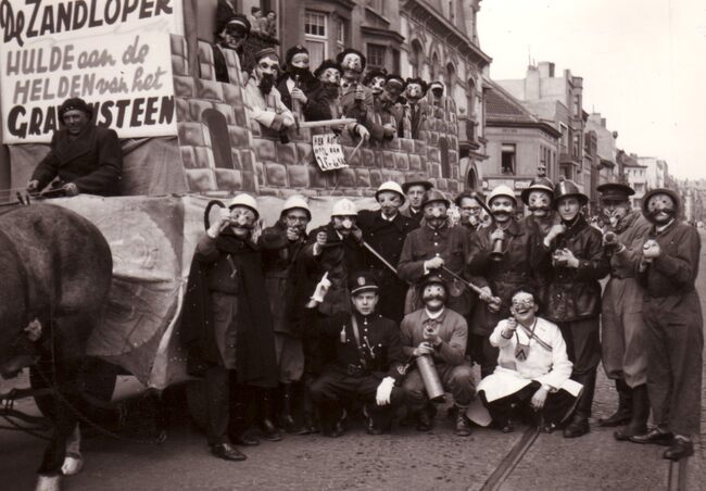 "Praal" wagen van de Oostendse universitairen "De Zandloper" in de carnavalstoet op de Torhoutsesteenweg, nabij het Prof. Mac Leodplein. De bezetting van het Gravensteen van Gent op 16 november 1949…
