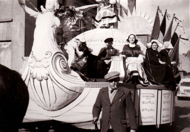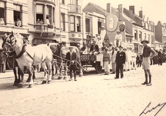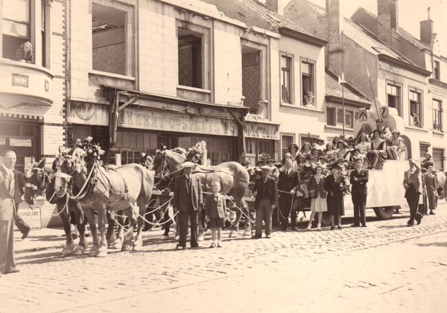 Een prachtige praalwagen getrokken door vier paarden uit de carnavalstoet op de Torhoutsesteenweg, tussen Leffinge - en Hennepstraat. De wagen staat voor het gebouw van bakkerij G. Splets, Torhoutsesteenweg 202, dat nog…