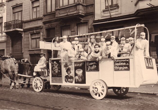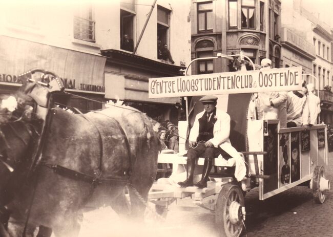 De Oostendse studenten van de "Gentse Hoogstudentenclub Oostende" met hun wagen nr.39 "De Reizende Operatietafel", getrokken door twee paarden in de carnavalstoet op de Torhoutsesteenweg. (Zie ook 2014…