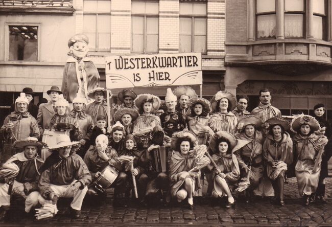 Een carnavalgroep uit het Westerkwartier, "'t Westerkwartier is Hier", met accordeon, boembas en trommel in de carnavalstoet op de Torhoutsesteenweg tussen Leffinge- en Wagenstraat.