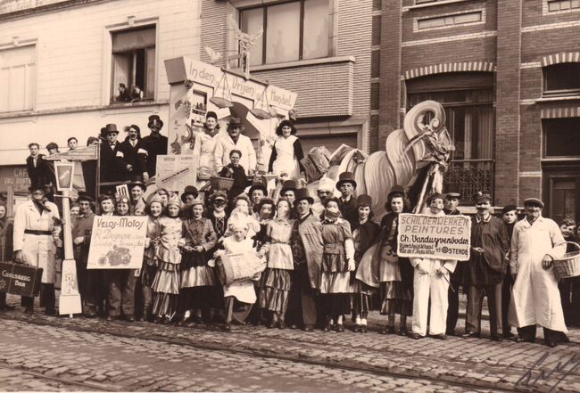 Een prachtige praalwagen getrokken door vier paarden met als thema, "Kolonialen", in de Carnavalstoet op de Torhoutsesteenweg, tussen de Leffigestraat (rechts) en de Hennepstraat. Achteraan een groep leerlingen…