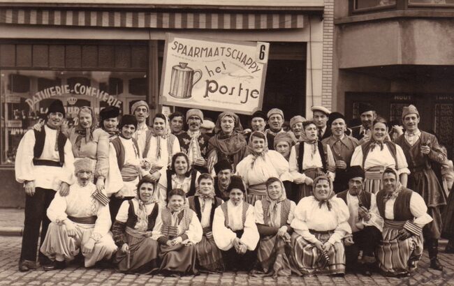 De groep van spaarmaatschappij "Het Postje" in de carnavalstoet op de Torhoutsesteenweg ter hoogte van het Porf. Mac Leodplein voor patisserie - confisserie "La Couronne".