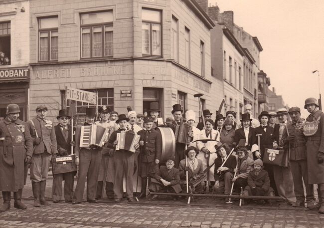 De groep "Pit en Stake" in de carnavalstoet op de Torhoutsesteenweg, hoek Blauw Kasteelstraat met Café Alfred Broucke. De naam van de groep komt van de obstakels tegen luchtlandingen die door de bevolking moest…