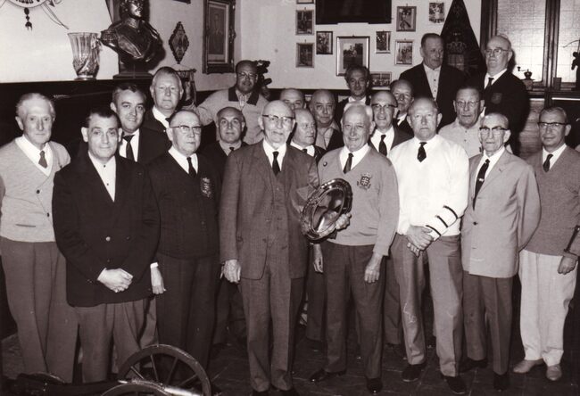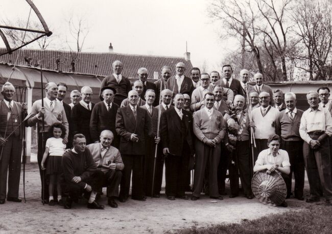 Leden van de balboogschtutters de Sint Jorisgilde na een wedstrijd in hun lokaal Café Armenonville in het Maria-Hendrikapark. Staand links, Laurent Soenen, de later voorzitter van de vereniging.