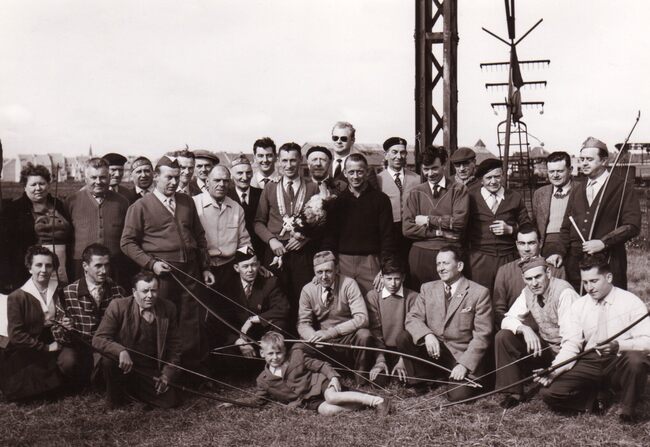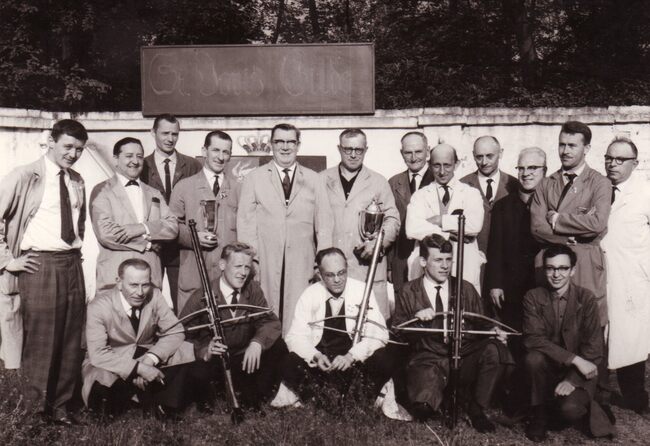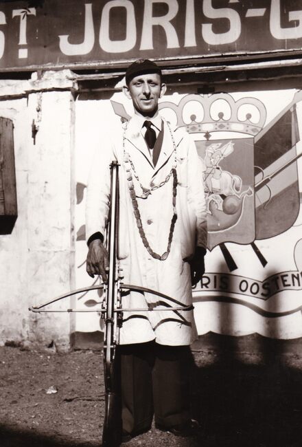 De handboogschutters van de Sint-Sebastiaansgilde in hun lokaal aan de Leffingestraat met hun hoofdman.