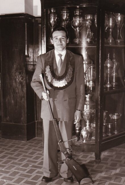 Een winnaar van een schietwedstrijd bij de balboogschutters de Sint Jorisgilde met hun lokaal in Café Armenonville in het Maria-Hendrikapark.
