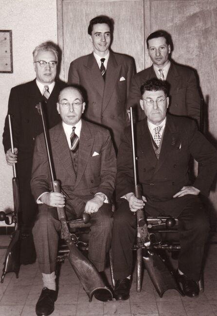 Vijf leden van schuttersvereniging "Les Carabiniers",. Rechts zittend, Richard Panesi en links staand, Luc Vermeulen
