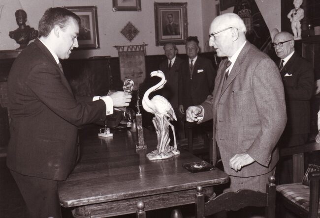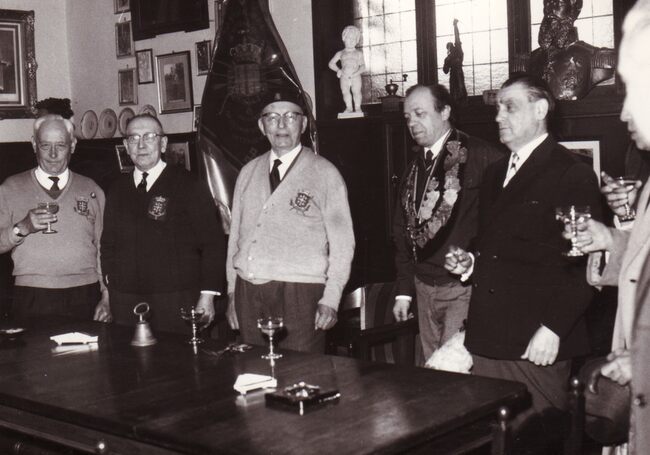 Een verdienstelijk lid van de handboogsschuttersvereniging Sint-Sebastiaan wordt gehuldigd in hun lokaal aan de Leffingestraat.