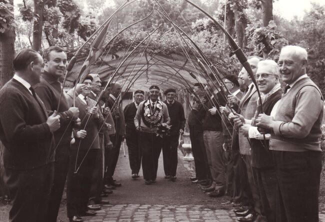 De handboogschutters van de Sint Sebastiaansgilde vormen een erehaag voor hun sire, Maurice Wandels bij hun lokaal aan de Leffingestraat.