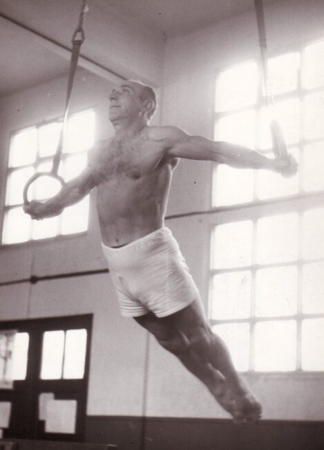 Een (keur) turner van vereniging Noordzee toont hoe het moet aan de ringen in de zaal aan de Heilig Hartlaan.