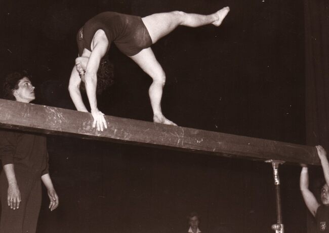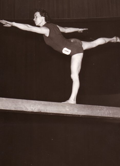 Een turnster van vereniging Noordzee (?) bij een oefening op de evenwichtsbalk.