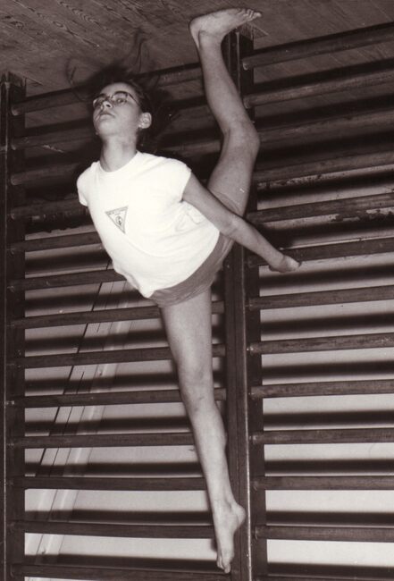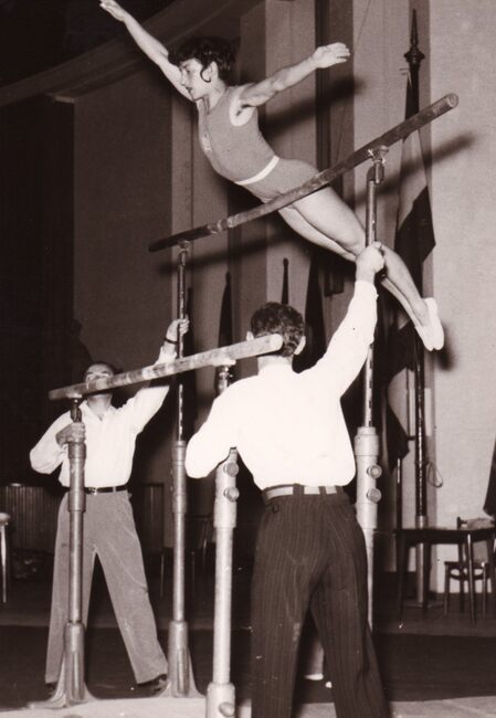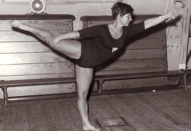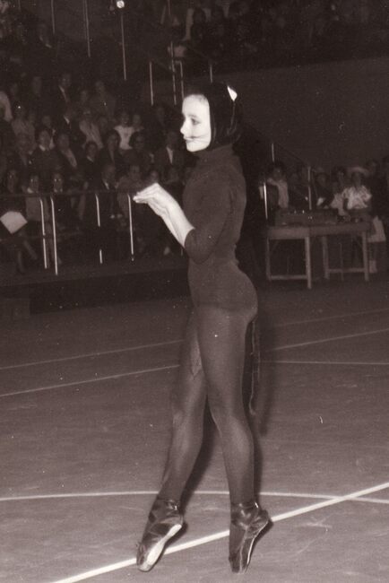 Een turnster (danseres) tijdens een optreden in het sportcentrum aan de Koninginnelaan.