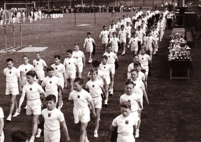Oostendse turnvereniging(en) tijdens een turnfeest op een voetbalveld (A.S.O. ?).