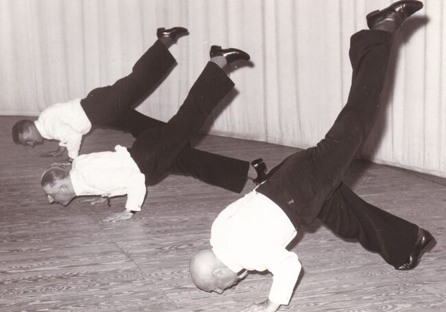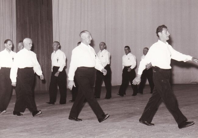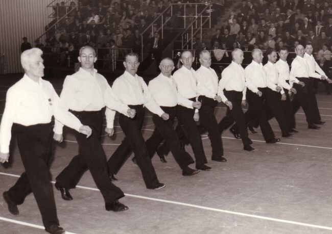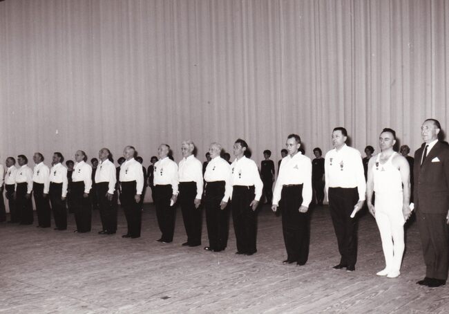 Enkele veteranen van turnvereniging Noordzee (?) bij een optreden in het kursaal.