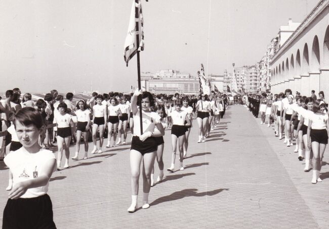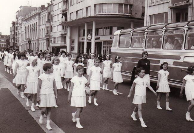 De senioren van turnvereniging OTV Noordzee bij een optreden in het kursaal. Achteraan op de scheidingslijn in kleur van de gordijnen, Maurice Vandecasteele