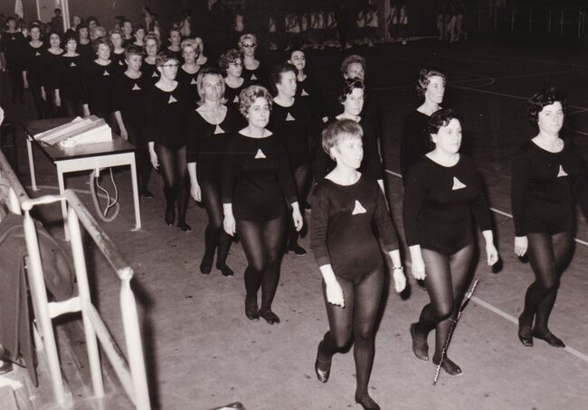 Sierlijke dames tijdens een optreden op een turnfeest in het sportcentrum aan de Koninginnelaan.