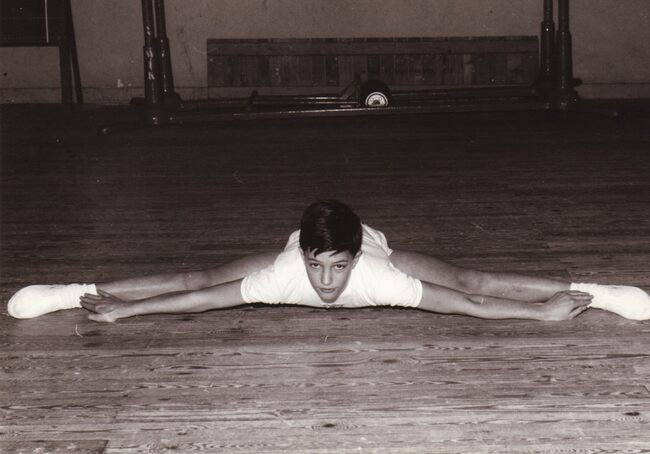 Een jonge beoefenaar van het turnen toont hoe het moet.