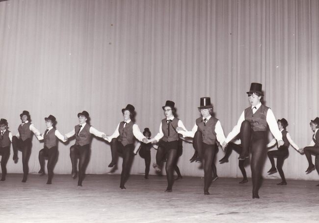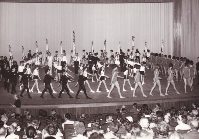 Turnfeest in het sportcentrum aan de Koninginnelaan,een meisjesgroep treedt op.