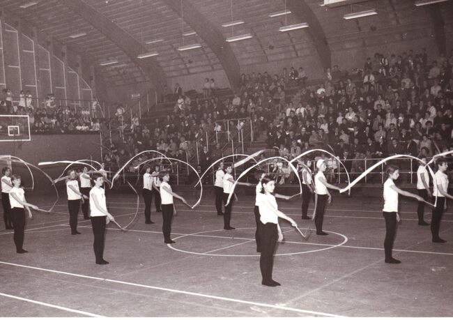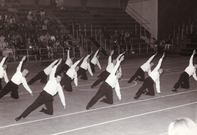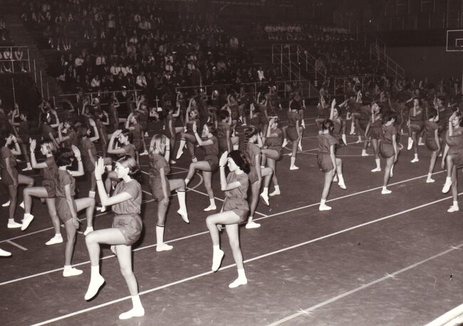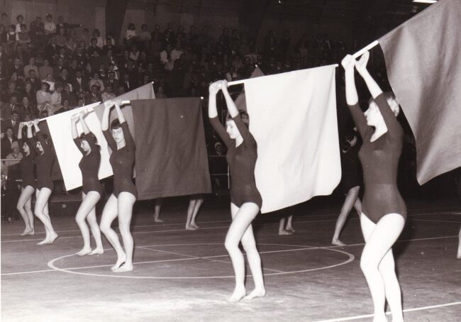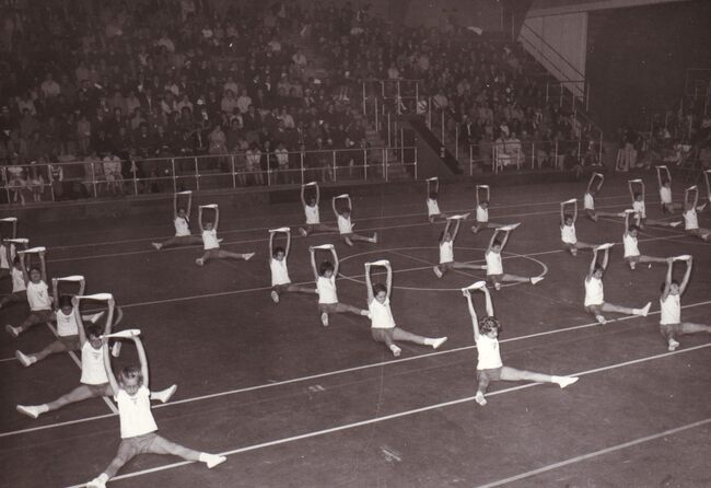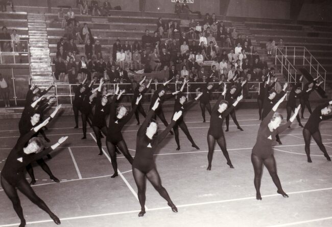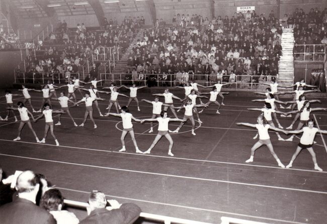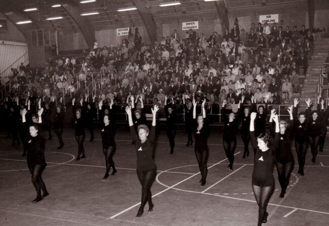 Optreden van de dames van een turnvereniging in het sportcentrum aan de Koninginnelaan.