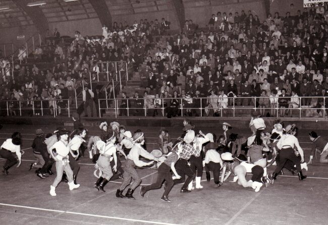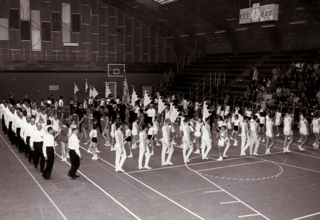 Apotheose van een turnfeest in het sportcentrum aan de Koninginnelaan.