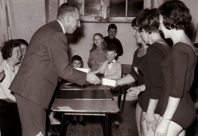 De voorzitter van een turnvereniging feliciteert drie turnsters.