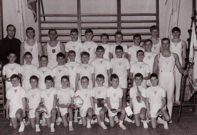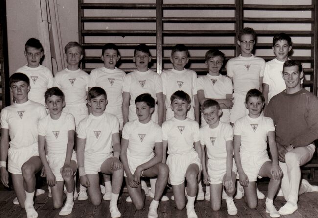 Een groep jongens van de turnvereniging "Willen is Kunnen" met hun "chef".