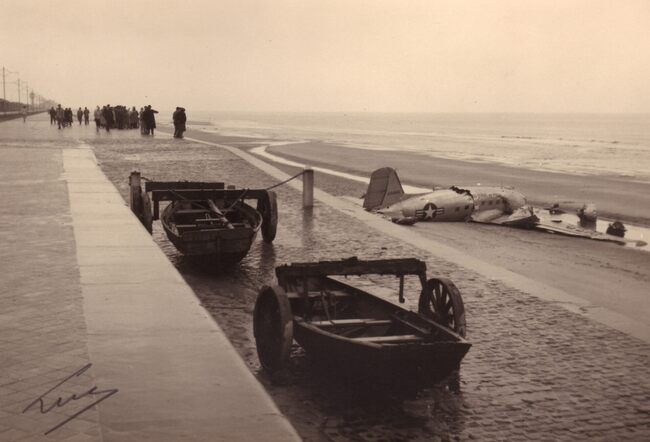 Formaat : 13 x 18 cm. - Een neergestorte Amerikaanse DC3 Dakota op het strand van Raversijde. Op de helling twee jollen van de reddingsdienst.