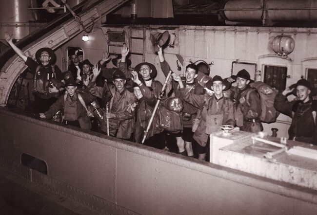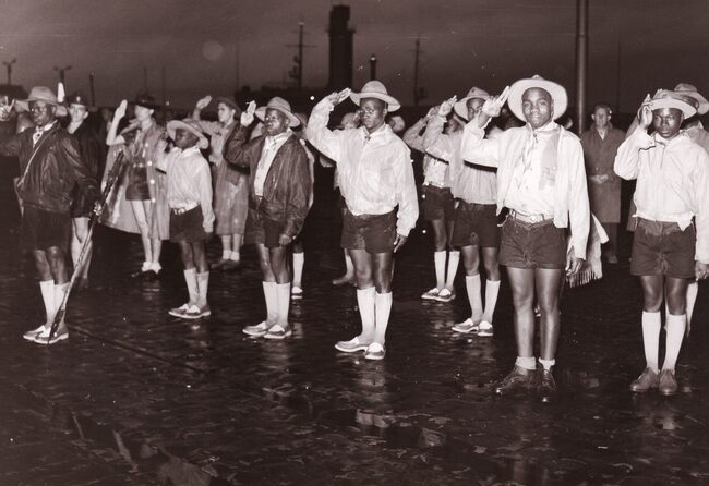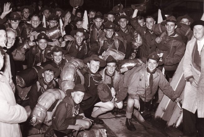 Formaat : 13 x 18 cm. - Een groep scouts klaar om aan boord te gaan van een schip.